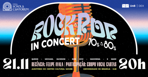 Coral Schola Cantorum apresenta: "Rock-Pop in Concert – 70s & 80s"ADUnB Associação dos Docentes da UnB e UnB Secretaria de Gestão Patrimonial – SPI -UnB – Brasília, DFSexta, 21 de Nov às 20:00